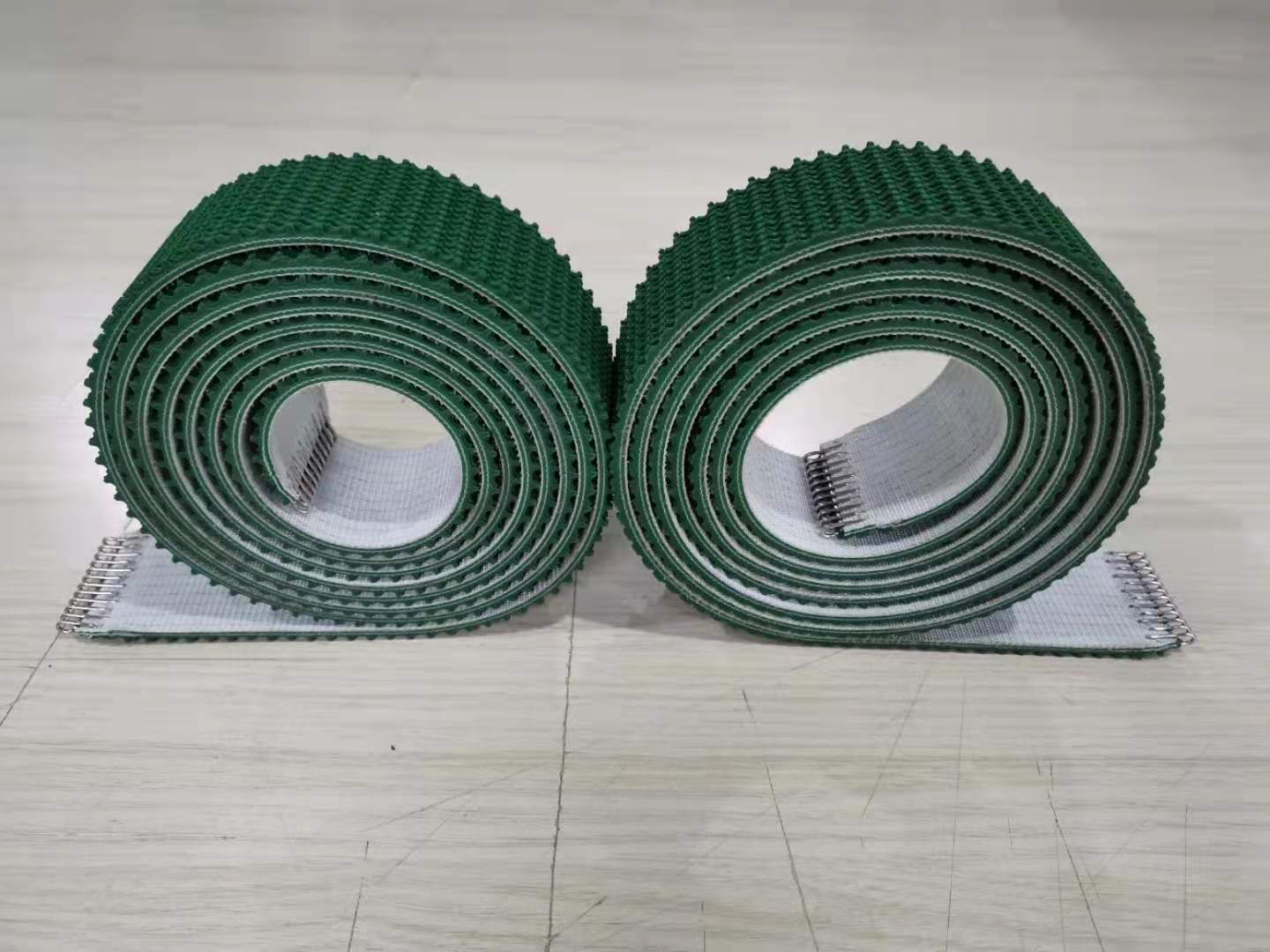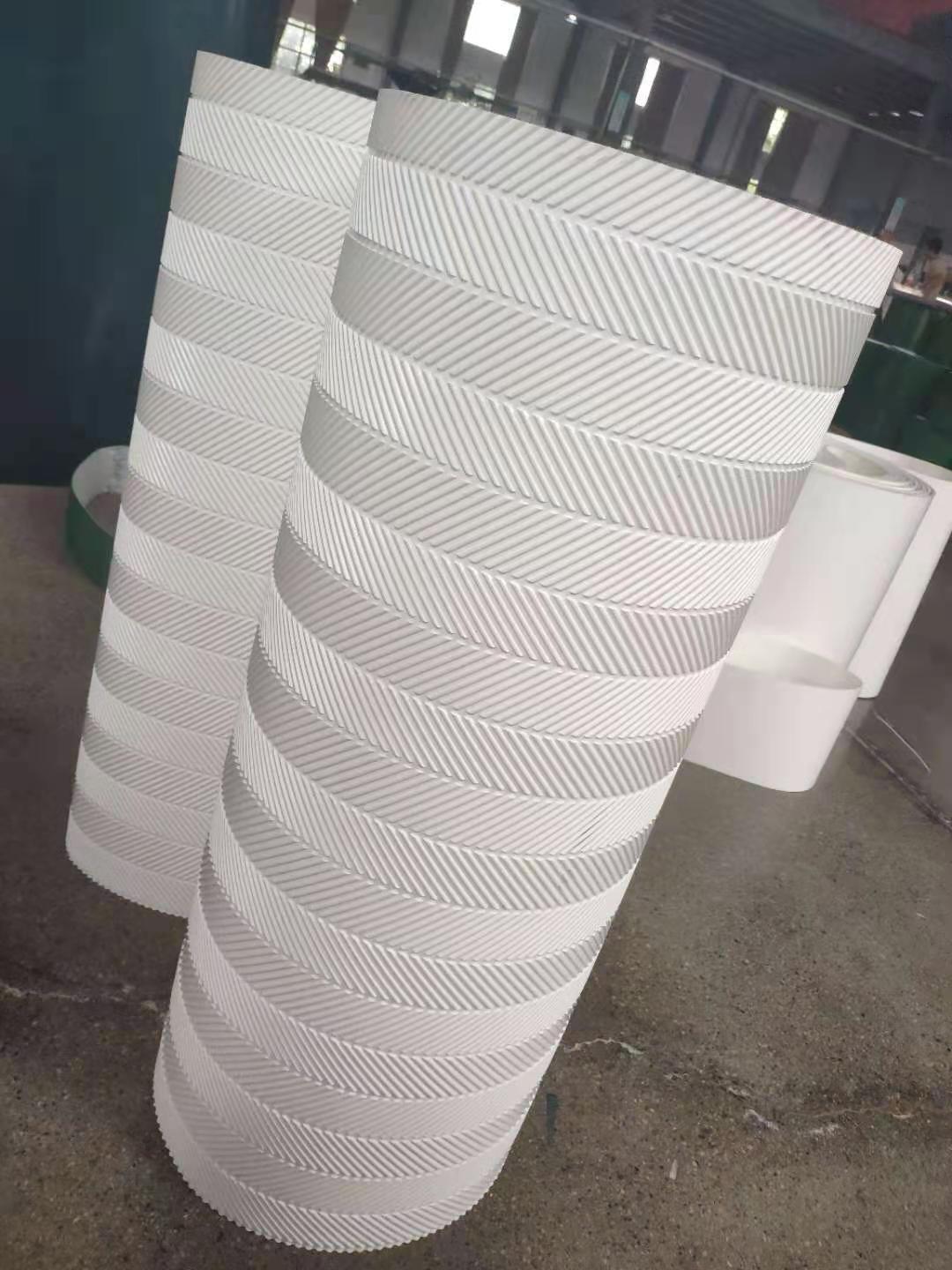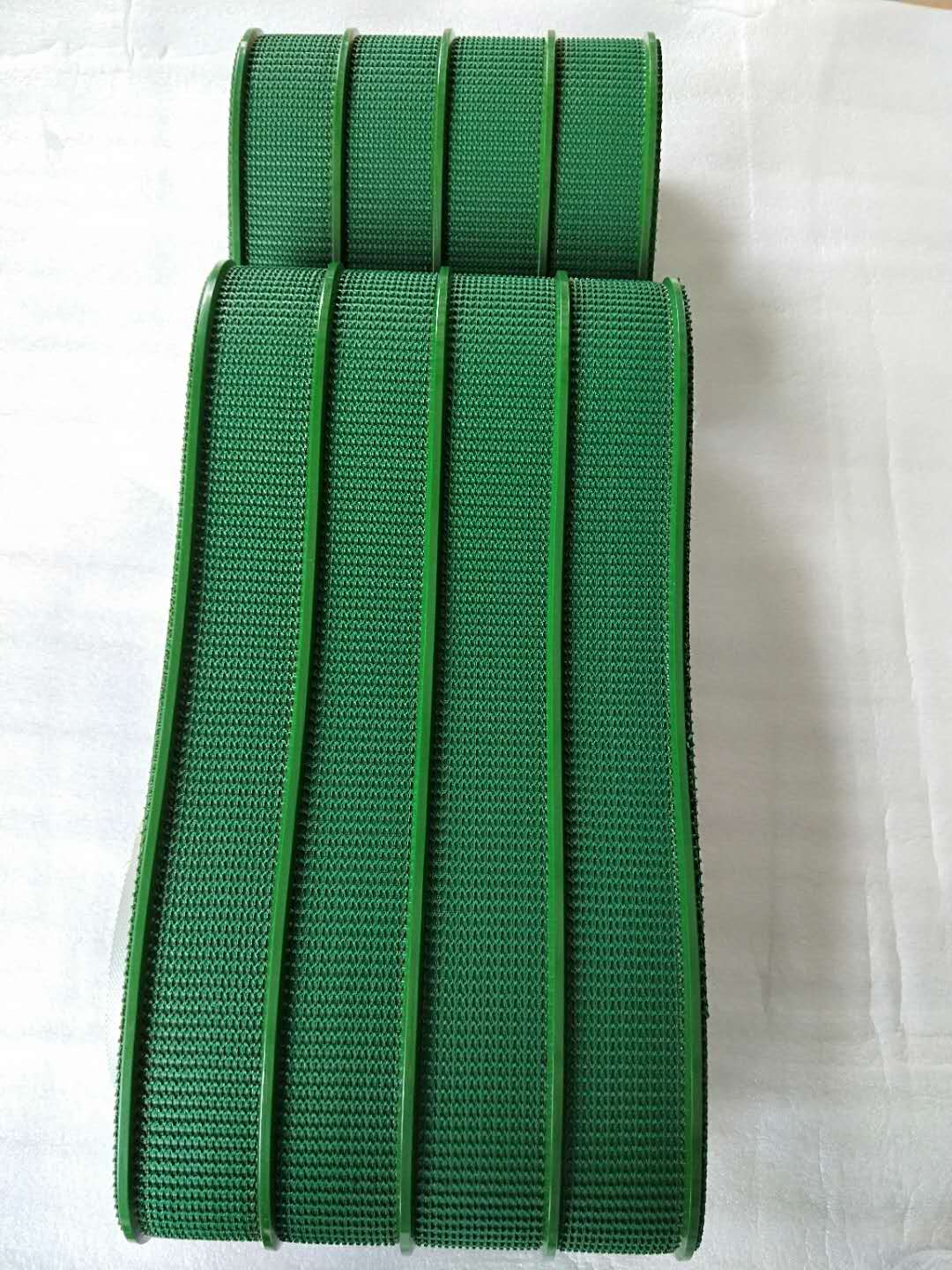 二、根據性能上分類可分為:輕度爬坡輸送帶,高度爬坡輸送帶,加擋板提升輸送帶,垂直提升機皮帶,防滑輸送帶砂光機輸送帶,耐磨輸送帶,較重物品輸送帶,輕質物品輸送帶,導向防跑偏輸送帶,打孔吸風輸送帶(吸風機皮帶),帶耙釘輸送皮帶,螺旋提升輸送帶,轉彎提升輸送帶,超寬物品輸送帶,海綿輸送帶,挖槽輸送帶,加檔塊輸送帶,封邊輸送帶,槽型輸送帶,刀口輸送帶等。