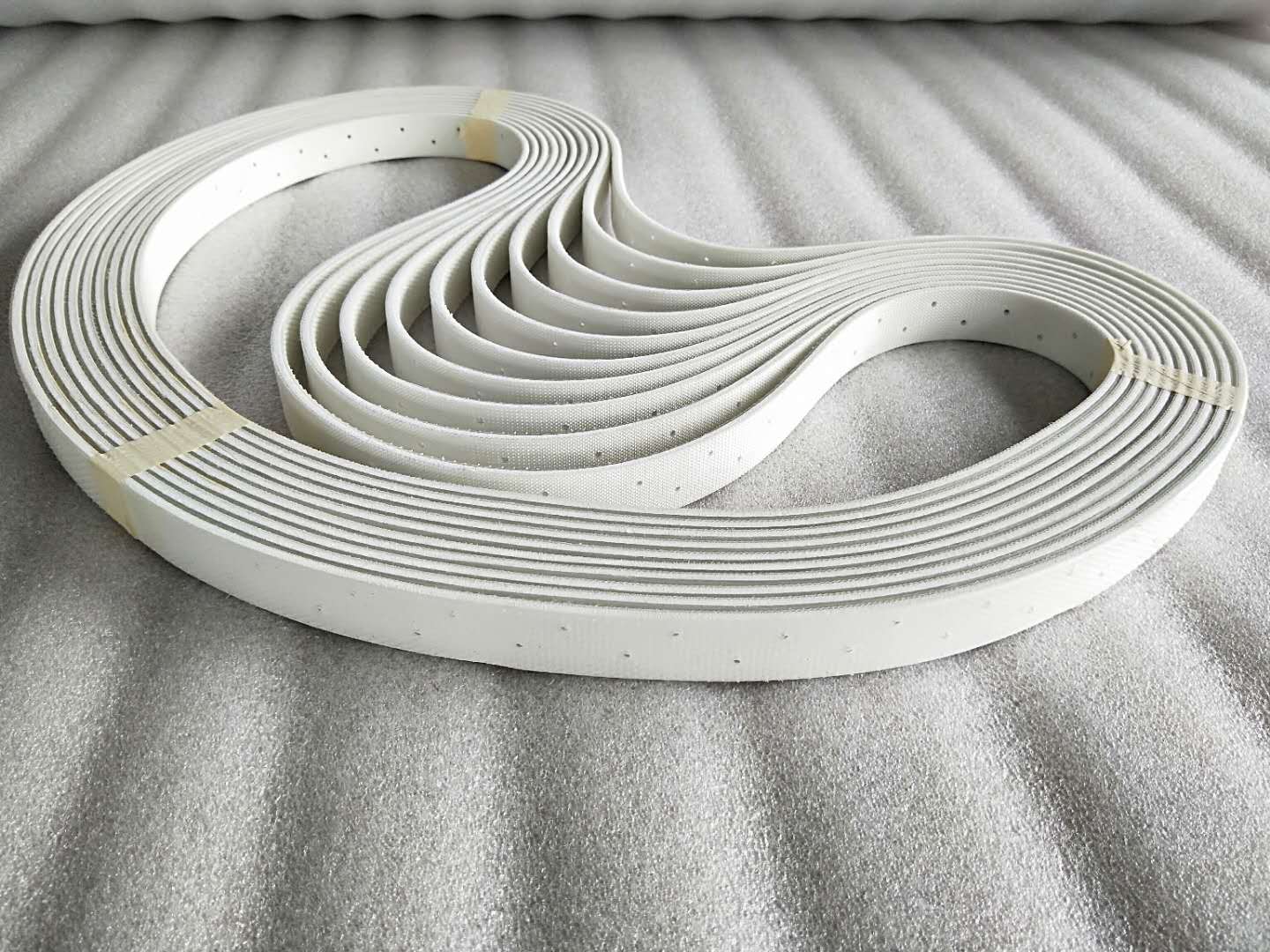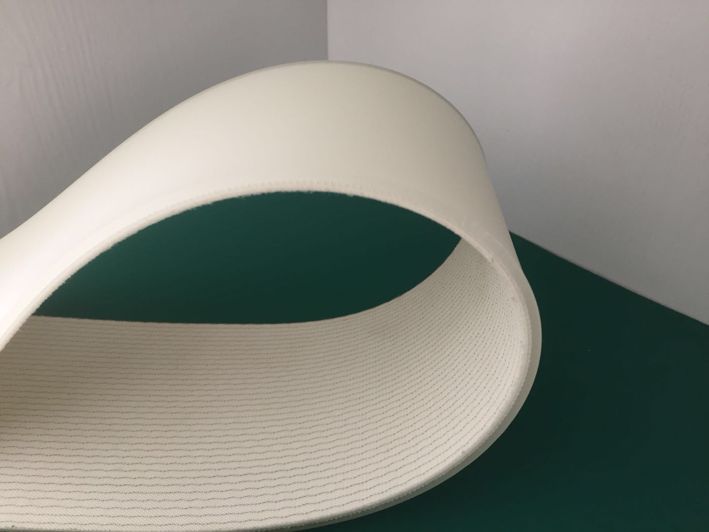 產(chǎn)品介紹: 產(chǎn)品制作: 將紗線整經(jīng)穿棕,編織成無縫環(huán)帶;所述的紗線為高強低伸滌綸紗、對位芳綸紗或玻璃纖維紗;(2)將含水質(zhì)量百分比低于0.1%熱塑性聚氨酯彈性體橡膠刮涂于所述的無縫環(huán)帶。助卷皮帶特性: 助卷機帶100%的聚酯織物層,使皮帶具有良好的抗壓力和拉張力,不會斷裂; 助卷機帶- 強力層為完全無縫編織,厚度均勻,柔順,尺寸精確; 助卷機帶- 具有良好的抗油性,可抗多
